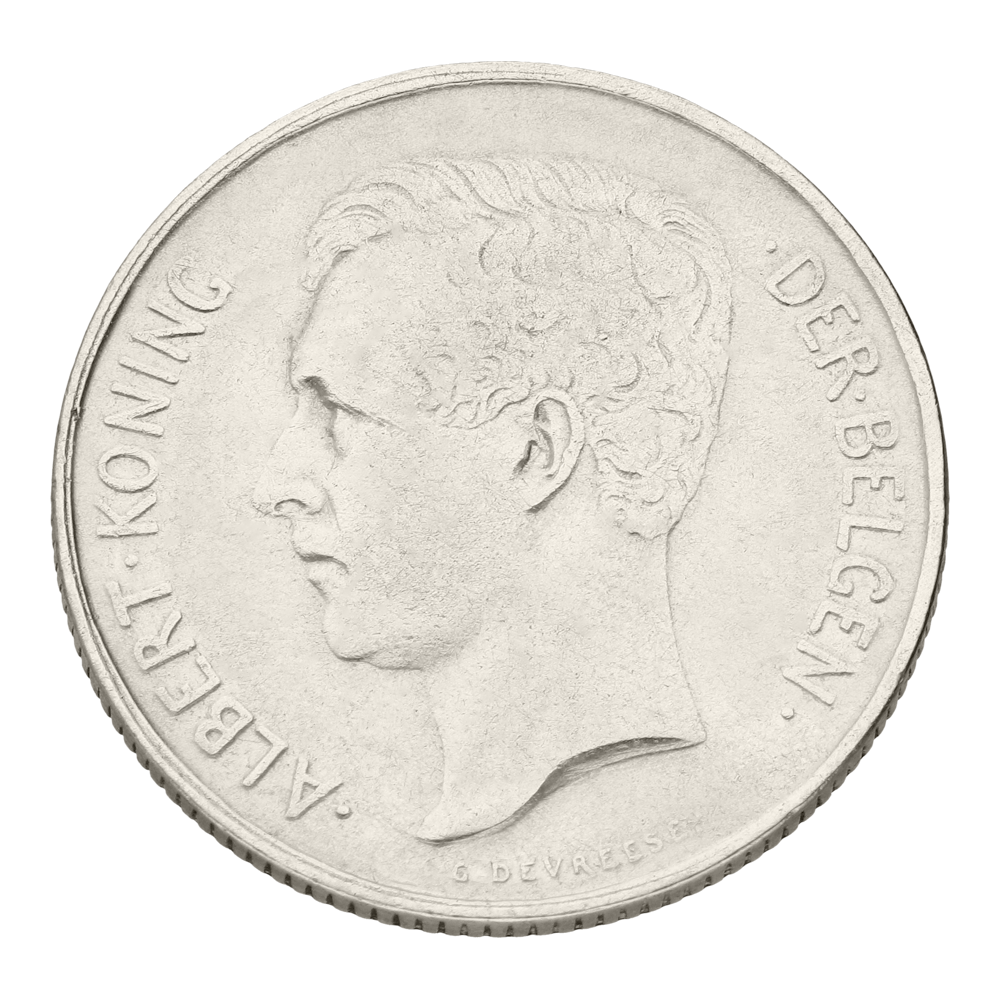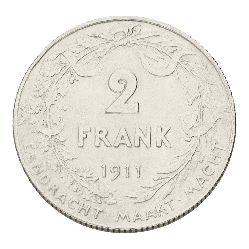 L’avers présente le profil du roi Albert I, entouré de l’inscription « ALBERT KONING DER BELGEN ». Le revers affiche la valeur « 2 FRANK » ainsi que la date, encadrés par une couronne composée d’un rameau d’olivier et d’un rameau de chêne, symboles de paix et de force. La devise nationale « EENDRACHT MAAKT MACHT » y figure, tandis que la tranche cannelée rappelle le soin octroyé à la frappe.