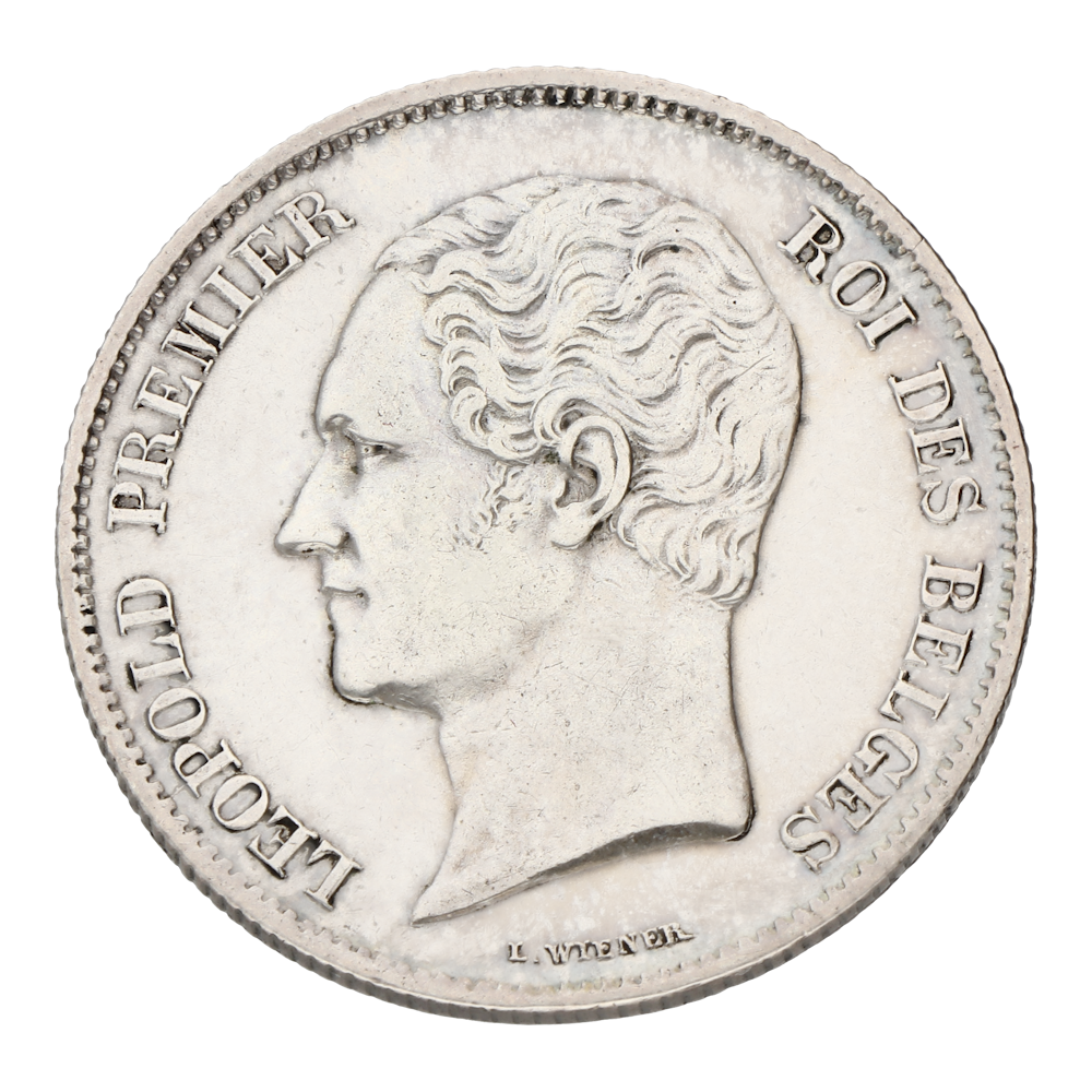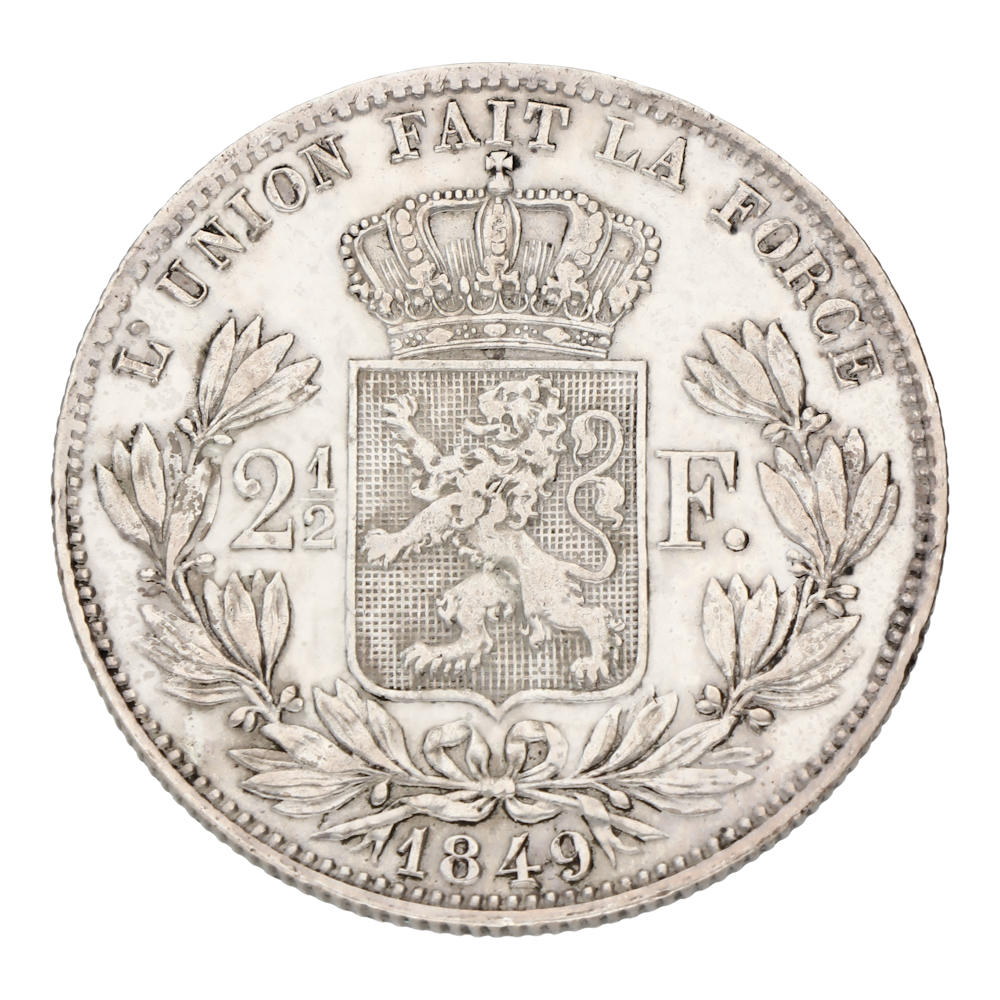 L’avers présente le profil gauche du roi Léopold Iᵉʳ, accompagné de la légende « LEOPOLD PREMIER ROI DES BELGES ». Le revers arbore les armoiries couronnées de la Belgique, entourées d’une couronne de laurier – symbole d’honneur et de courage – au-dessous de laquelle figurent la valeur « 2½ F » et l’année de frappe. La tranche finement cannelée témoigne d’un savoir-faire artisanal typique des ateliers monétaires de l’époque.
