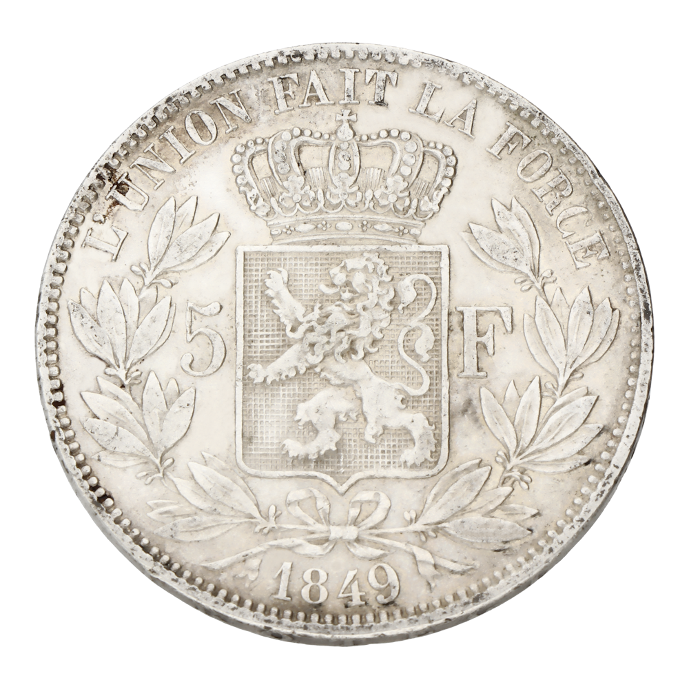 Cette pièce a été frappée entre 1849 et 1865, sous le règne du roi Léopold I, premier roi des Belges. Cette période de consolidation a été marquée par la stabilité politique, le développement économique et l’émergence de symboles nationaux. Le 5 Francs reflète cette époque et servait comme moyen de paiement quotidien important. C’est un témoignage tangible de l’identité et de la fierté grandissante de la Belgique au XIXe siècle.