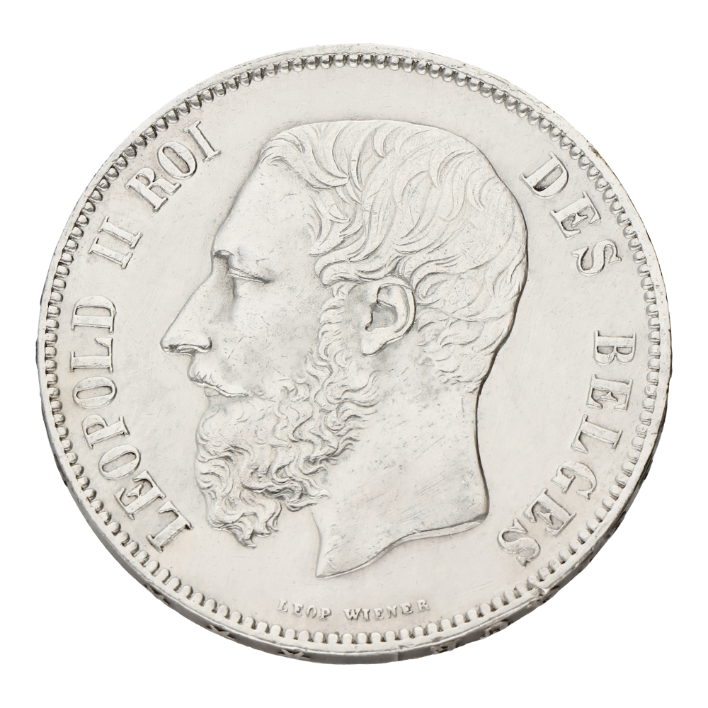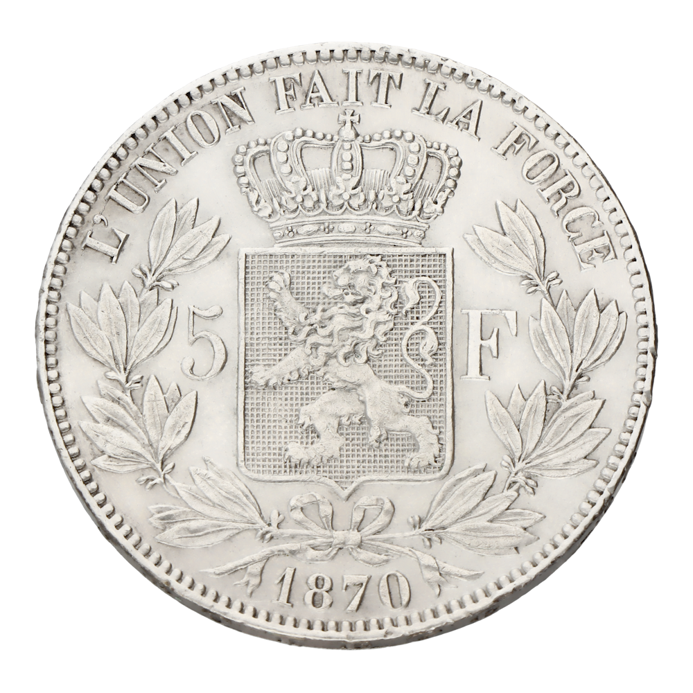 Léopold II devint roi des Belges en 1865, à la suite du décès de son père, le roi Léopold I. La transition s’effectua de manière relativement calme et inaugura une longue période de règne, durant laquelle la Belgique se développa industriellement et renforça sa position internationale. Le 5 Francs Léopold II, frappé entre 1865 et 1878, reflète cette époque de stabilité politique et de croissance économique. La pièce était un moyen de paiement important et symbolise la continuité et la fierté de la monarchie belge au XIXe siècle.