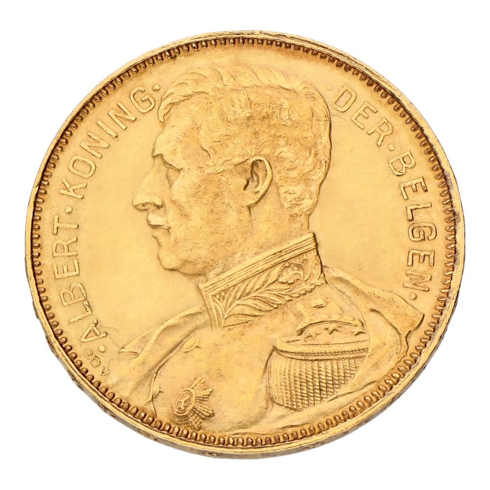 Frappée en 1914, cette pièce d’or fut émise sous le règne du roi Albert Iᵉʳ (1909-1934). Elle est composée de 90 % d’or pur (900/1000) et de 10 % de cuivre, pour un poids de 6,4516 g et un diamètre de 21 mm. Il s’agit de la seule pièce d’or frappée au nom du roi Albert I, ce qui en fait une monnaie rare et recherchée. Symbole d’une époque troublée, elle évoque la bravoure du roi Albert Iᵉʳ, surnommé le Roi Chevalier, qui défendit la Belgique pendant la Première Guerre mondiale. Cette pièce constitue un témoin tangible de la résilience et de la fierté nationale belge.