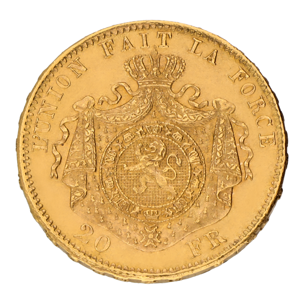 Frappée entre 1867 et 1882, la pièce de 20 Francs fut émise sous le règne du roi Léopold II, qui régna de 1865 à 1909. Cette période fut marquée par une expansion industrielle spectaculaire et un profond renouvellement urbain, plaçant la Belgique au cœur de la modernité européenne. La version dite “Barbe Fine” se distingue par un portrait plus finement gravé du souverain, illustrant le soin artistique et le perfectionnement technique atteints par la Monnaie Royale de Belgique à cette époque.