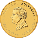 Le revers de la pièce porte le portrait de le Roi Charles III, élément important de la Lunar. Ce côté de la pièce indique aussi la valeur nominale de 25 dollars (AUD), le poids de ¼ oz et la pureté de la pièce.