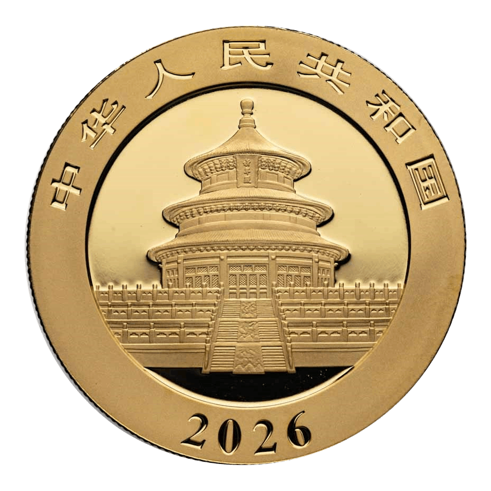 L'avers de la Panda en or 30 g de 2026 représente le Temple du Ciel de Pékin. Chaque année, le temple accueille une cérémonie au cours de laquelle les empereurs priaient les Dieux pour une bonne récolte. En outre, le bord de la pièce indique en mandarin « Zhonghua Renmin Gongheguo », ce qui signifie République populaire de Chine. L'année de la pièce est indiquée en bas.