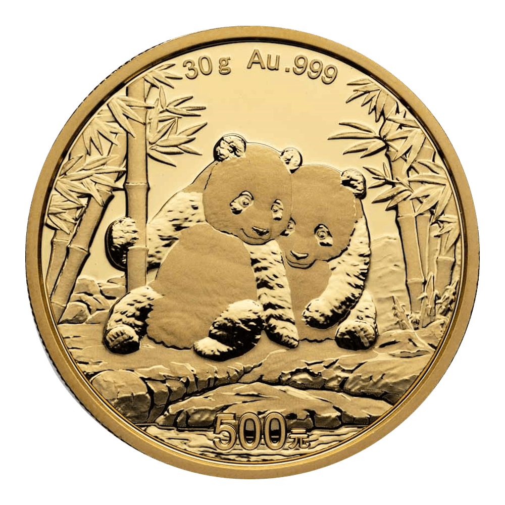 Frappée pour la première fois par la China Gold Coin Corporation, la pièce Panda en or possède une valeur nominale qui varie en fonction de son poids. La Panda de 30 grammes équivaut à 500 yuans.