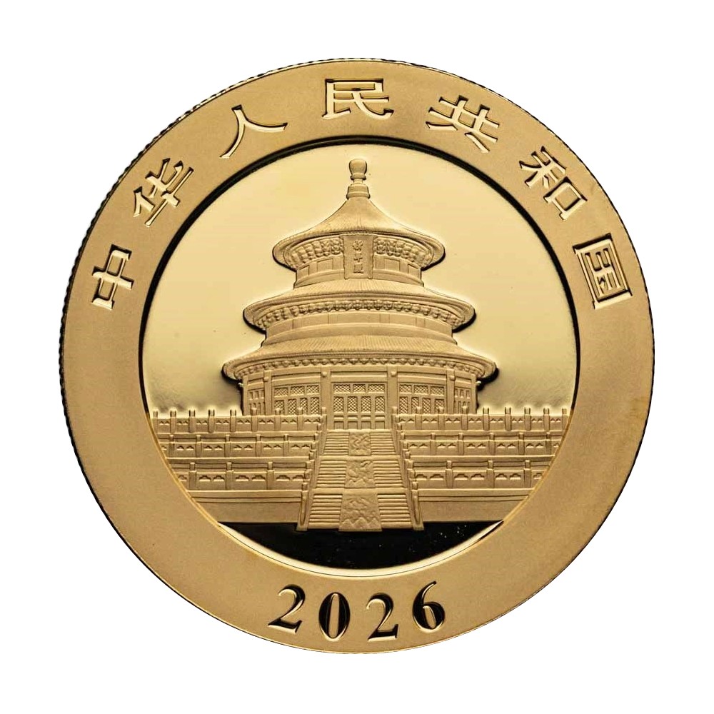 L'avers de la Panda en or 30 g de 2026 représente le Temple du Ciel de Pékin. Chaque année, le temple accueille une cérémonie au cours de laquelle les empereurs priaient les Dieux pour une bonne récolte. En outre, le bord de la pièce indique en mandarin « Zhonghua Renmin Gongheguo », ce qui signifie République populaire de Chine. L'année de la pièce est indiquée en bas.