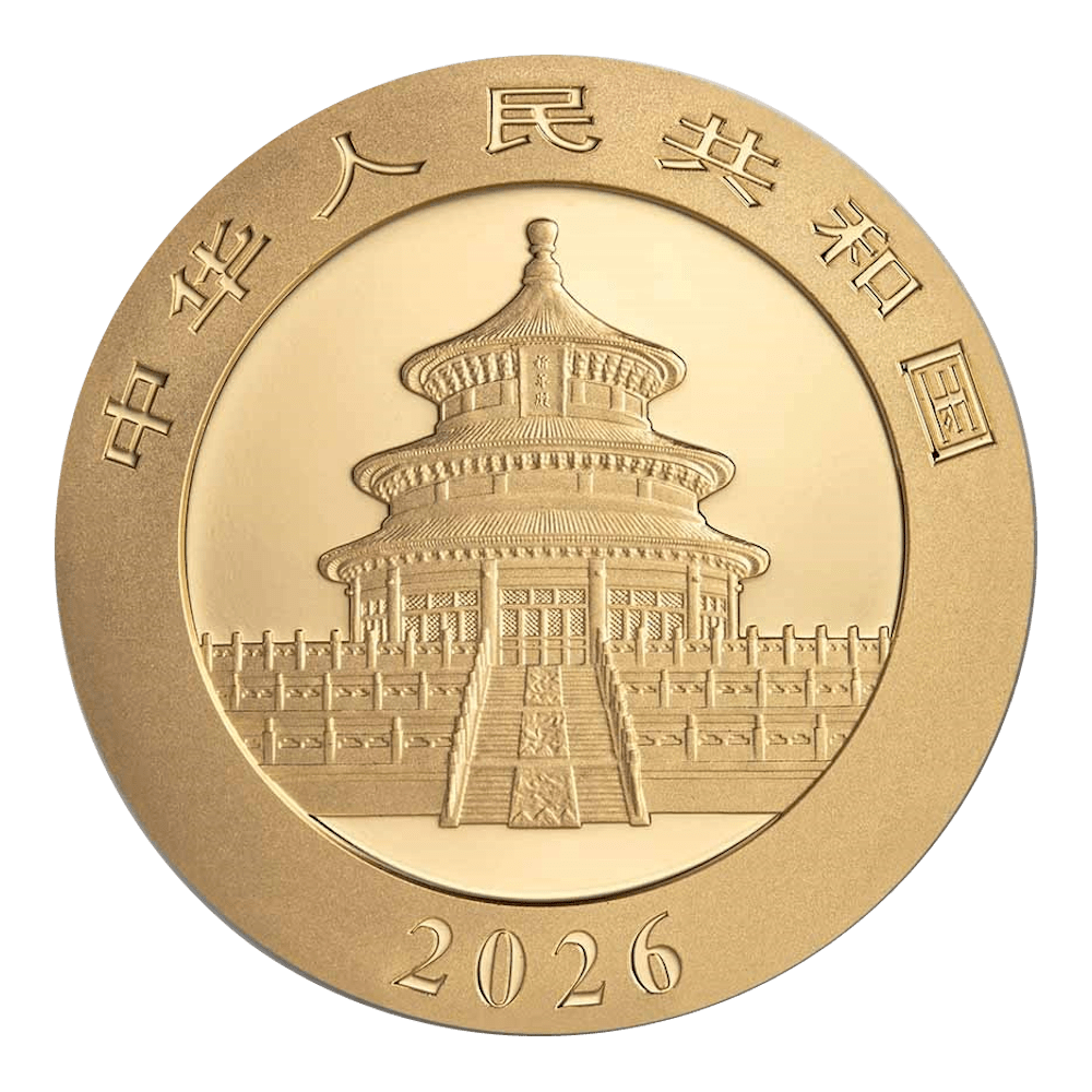 L'avers de la Panda en or 8g de 2026 représente le Temple du Ciel de Pékin. Chaque année, le temple accueille une cérémonie au cours de laquelle les empereurs priaient les Dieux pour une bonne récolte. En outre, le bord de la pièce indique en mandarin « Zhonghua Renmin Gongheguo », ce qui signifie République populaire de Chine. L'année de la pièce est indiquée en bas.
